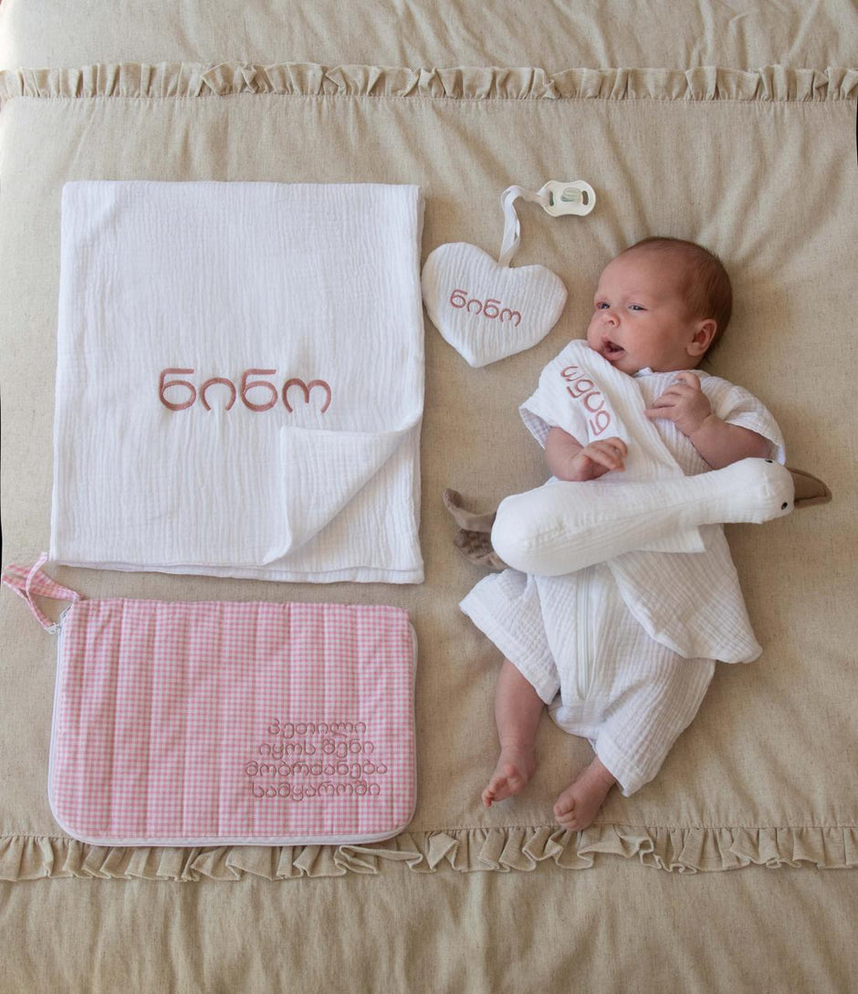 3. მუსლინის ბავშვის საბანი – 70 × 75 სმ / 27.6 × 29.5 ინჩი. ძალიან რბილი, სუნთქვადი, ნაქარგი თქვენი ბავშვის სახელით.
