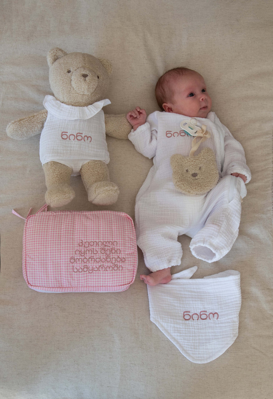 2. რბილი სათამაშო (დათვი ან კურდღელი) – ბავშვის პირველი საყვარელი, რბილი და ჩახუტებადი, შესაბამისი მუსლინის სამოსით.